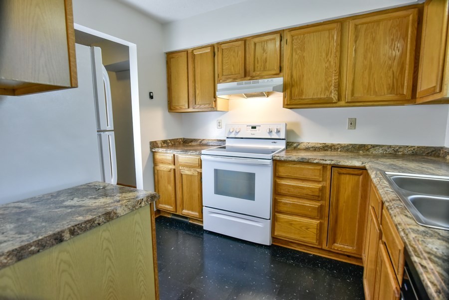 New counters, fridge, and stove in kitchen