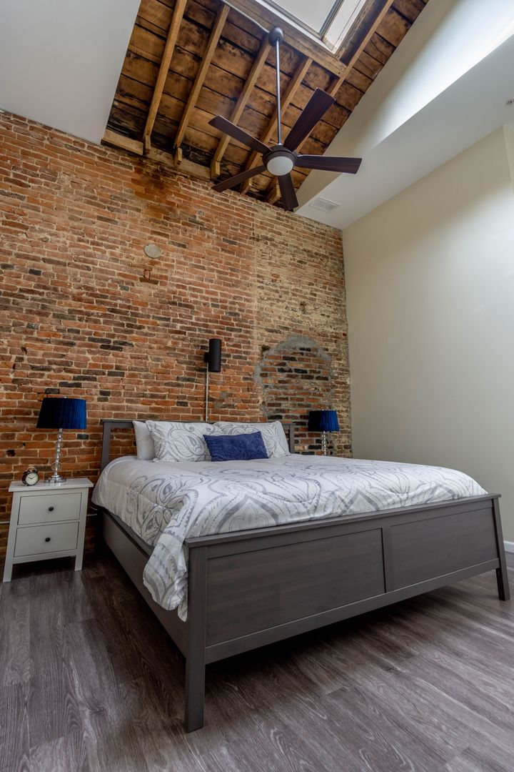 108 W 6th St unit C is a beautiful 3 bedroom 2 bathroom rustic/industrial-style apartment with an amazing view of the courthouse and the square. There are three upper-level residential units in this building with commercial space below. Unit C has been fully remodeled featuring vaulted ceilings, skylights, exposed brick accent walls, large windows, a loft and rooftop access. One of the large bedrooms has an en-suite bathroom, and the second full bathroom is in the main hallway. There is plenty of counter space in the single-wall kitchen with high-end appliances and gorgeous hickory cabinetry. Laminate wood flooring was installed throughout the entire apartment and complements the gray and tan walls. All utilities will be tenant responsibility (water, electricity, gas, cable/internet, and trash).